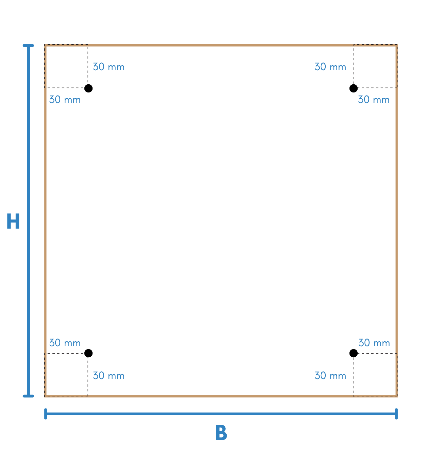 Een andere veelgebruikte manier om het glas aan de muur te monteren, is door een viertal gaten in het glas te laten boren. Vervolgens kan het vastgezet worden d.m.v. afstandhouders, welke apart kunnen worden bijbesteld. Maak je gebruik van de afstandhouders die wij adviseren, kies dan bij het samenstellen van de glazen keukenachterwand op maat, om gaten met een doorsnede van 6 mm te laten boren. De boringen worden standaard aangebracht op 30 mm, gemeten vanaf de rand van het glas tot het hart van de boring.