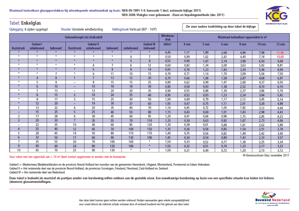 Het uitgangspunt is dat het glas in een kozijn wordt geplaatst op een verticale wijze (staand in een kozijn), waarbij het glas rondom in een raamkozijn wordt bevestigd. Bij het samenstellen van de windlast berekening glas, is er geen rekening gehouden met glas dat horizontaal (vlak) is gelegd in een veranda, serredak of daklicht. Daarvoor geldt een andere criteria, dat situatie afhankelijk vastgesteld wordt. Daarvoor is de windlast tabel en dikte bepaling niet geschikt.